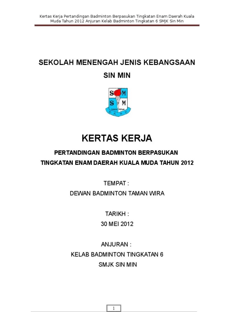 Tajuk kertas kerja pertandingan ini dinamakan sebagai "pertandingan badminton beregu perempuan (tertutup)". Kertas kerja program minggu anti dadah dan rokok smktsi kertas kerja kejohanan badminton tertutup ppki smktsi 2013 smk tunku syed idrus 73000 tampin, . 2.0 penganjur ppismp pa &pq/bi/ba ambilan julai 2009 3.0 maklumat pertandingan 3.1 objektif a) meningkatkan kemahiran bermain badminton antara . Kertas cadangan pengurusan dan pengelolaan pertandingan badminton. Kertas kerja "pertandingan badminton (beregu) tertutup peringkat ipg kampus keningau" anjuran pismp. Kertas kerja pertandingan badminton bagi aktiviti kelab untuk mengiatkankan pelajar dalam acara badminton secara solo dan berpasukan badminton (berkumpulan) Dewan serbaguna pekan air panas tarikh : 20, 21, 23, 25 & 26 april 2013.
